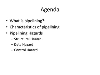 Pipelining is a technique used in computer processors to overlap the execution of instructions to enhance performance. It works by dividing instruction execution into discrete stages, such as fetch, decode, execute, memory, and write-back, so that multiple instructions can be in different stages at the same time. In a pipelined processor, the average time to complete an instruction is reduced compared to a non-pipelined processor, leading to higher throughput. However, special techniques are needed to handle data and structural hazards that can occur when instructions interact in unexpected ways within the pipeline.