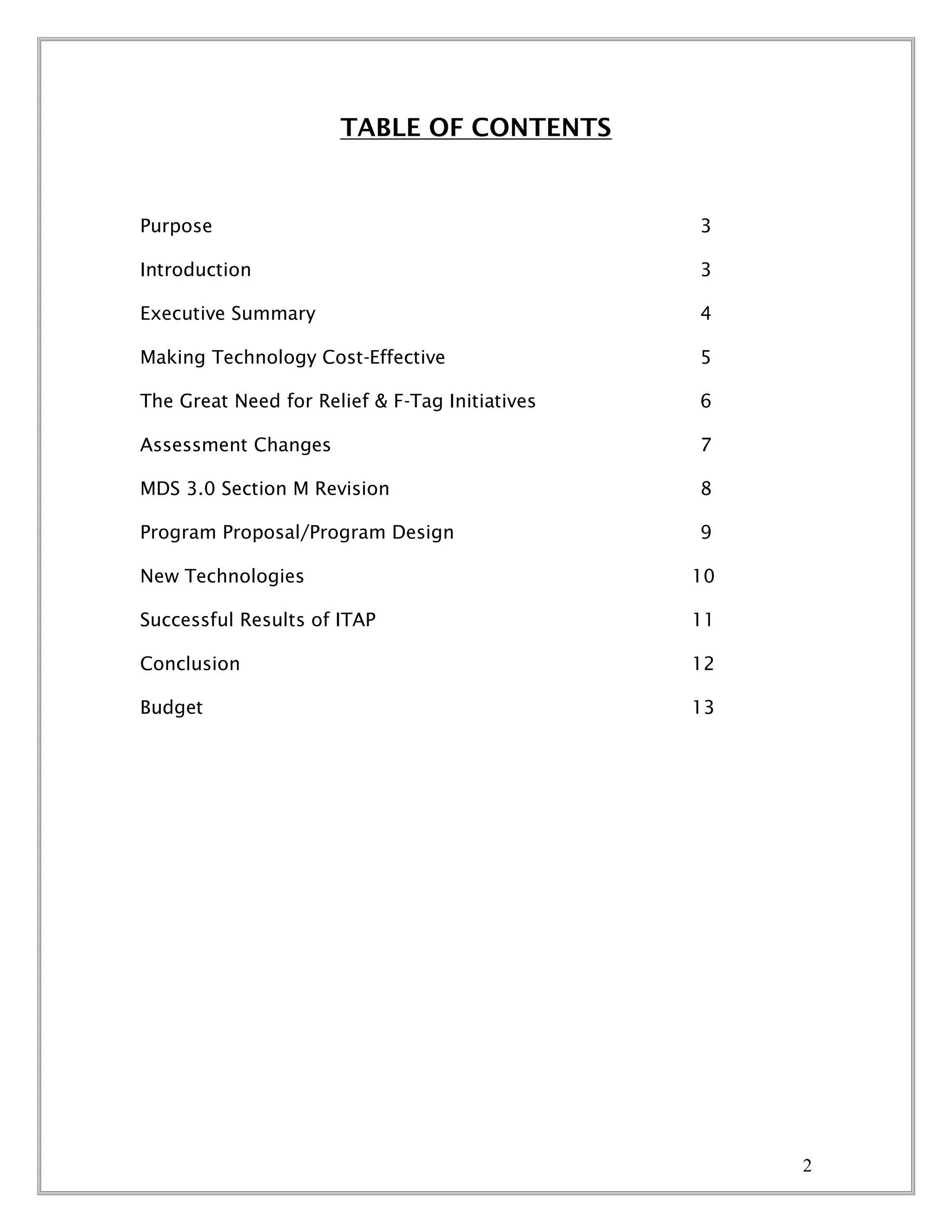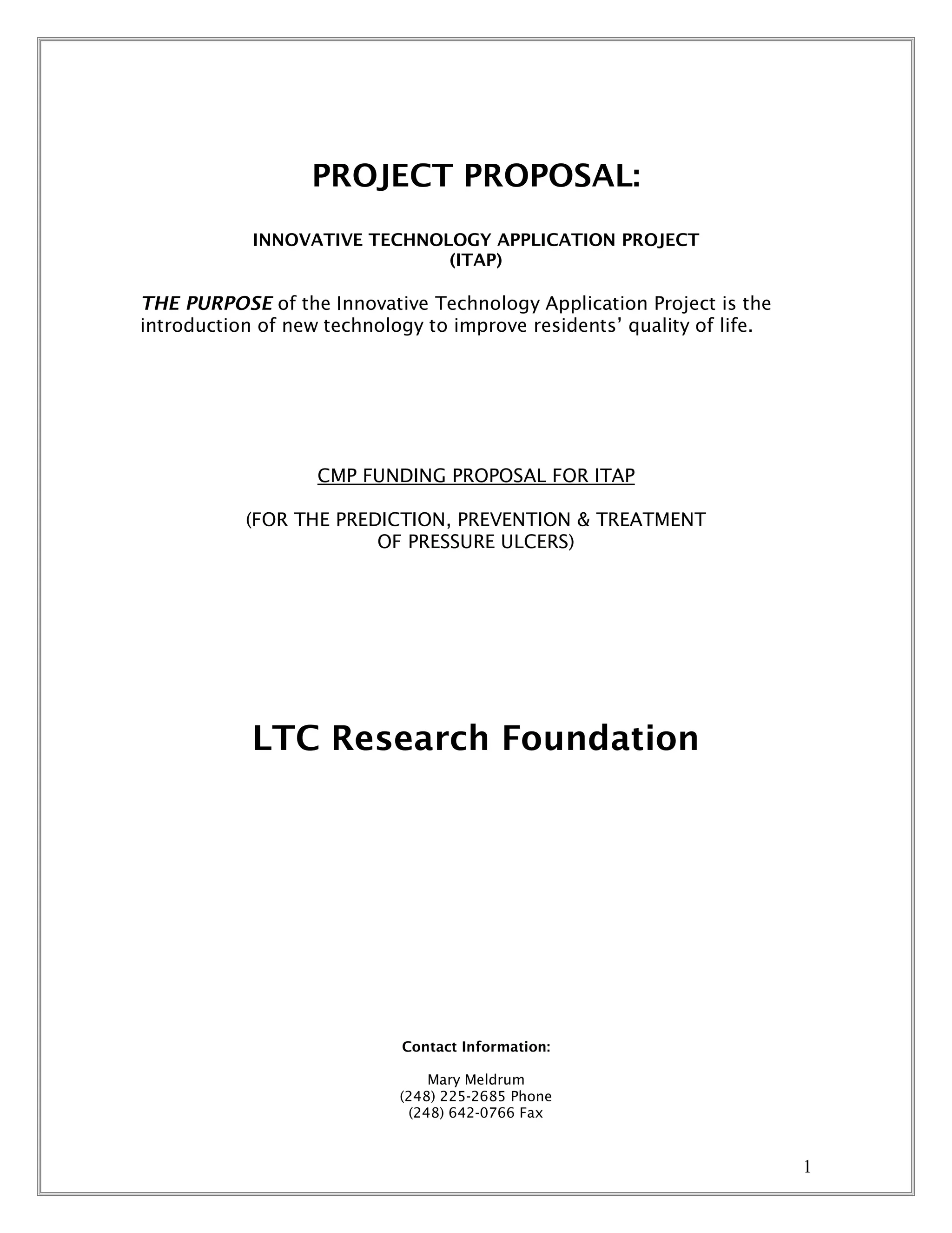 This document proposes a project called the Innovative Technology Application Project (ITAP) that aims to introduce new technologies to improve quality of life for long term care residents by better predicting, preventing, and treating pressure ulcers. The proposal seeks funding from the Center for Medicare and Medicaid Services to pilot these technologies in over 20 nursing homes for one year. It outlines the high costs and prevalence of pressure ulcers, and how new technologies like ultrasound imaging and thermal imaging could help identify deep tissue injuries earlier and improve outcomes. The goal of the pilot is to demonstrate how these technologies can be effectively and cost-efficiently incorporated into long term care facilities.