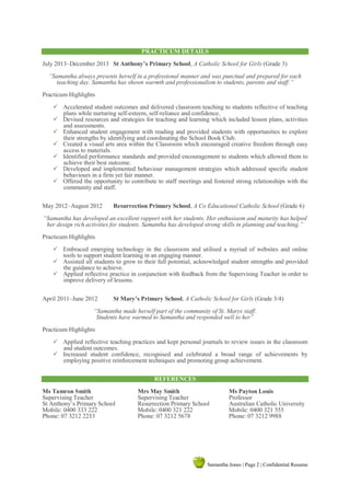 Samantha Jones is applying for a graduate teaching position in the Catholic education system. She has a Bachelor's degree in Educational Studies from Australian Catholic University, where she achieved high distinctions in several subjects. She has experience teaching grades 3, 4, and 6 through practicums at three Catholic primary schools, receiving strong references praising her teaching ability, student rapport, and classroom management. Samantha is actively involved in her local Anglican church and commits to ongoing professional development. She is seeking a full-time graduate teaching role and provides three references including her supervising teachers and university professor.