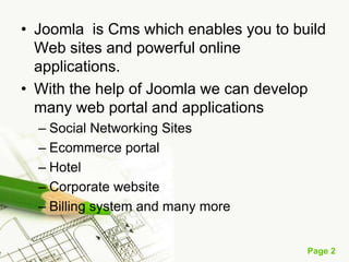 The document discusses content management systems (CMS) like Joomla and learning management systems (LMS) like Moodle. It provides an overview of the features and capabilities of Joomla and Moodle, including how they can be used to build various types of websites and applications or enable online learning. Joomla is an open source CMS written in PHP that uses a MVC framework and supports extensions like components, modules, and plugins. Moodle is an open source LMS also written in PHP that provides features for online courses like assignments, discussions, quizzes, and grading. Both systems have undergone numerous version updates and offer customizable templates and third-party extensions.