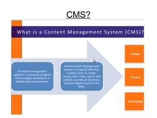CMS stands for Content Management System. It is web-based software that makes updating website content much easier than without it. There are different types of CMS including hosted, commercial, and open source. Reasons to implement a CMS include providing a consistent user experience, increasing customer retention, improving productivity, and improving security. Key features of CMS include easy content editing, previewing before publishing, extensibility, templates, version management, and different user access levels.