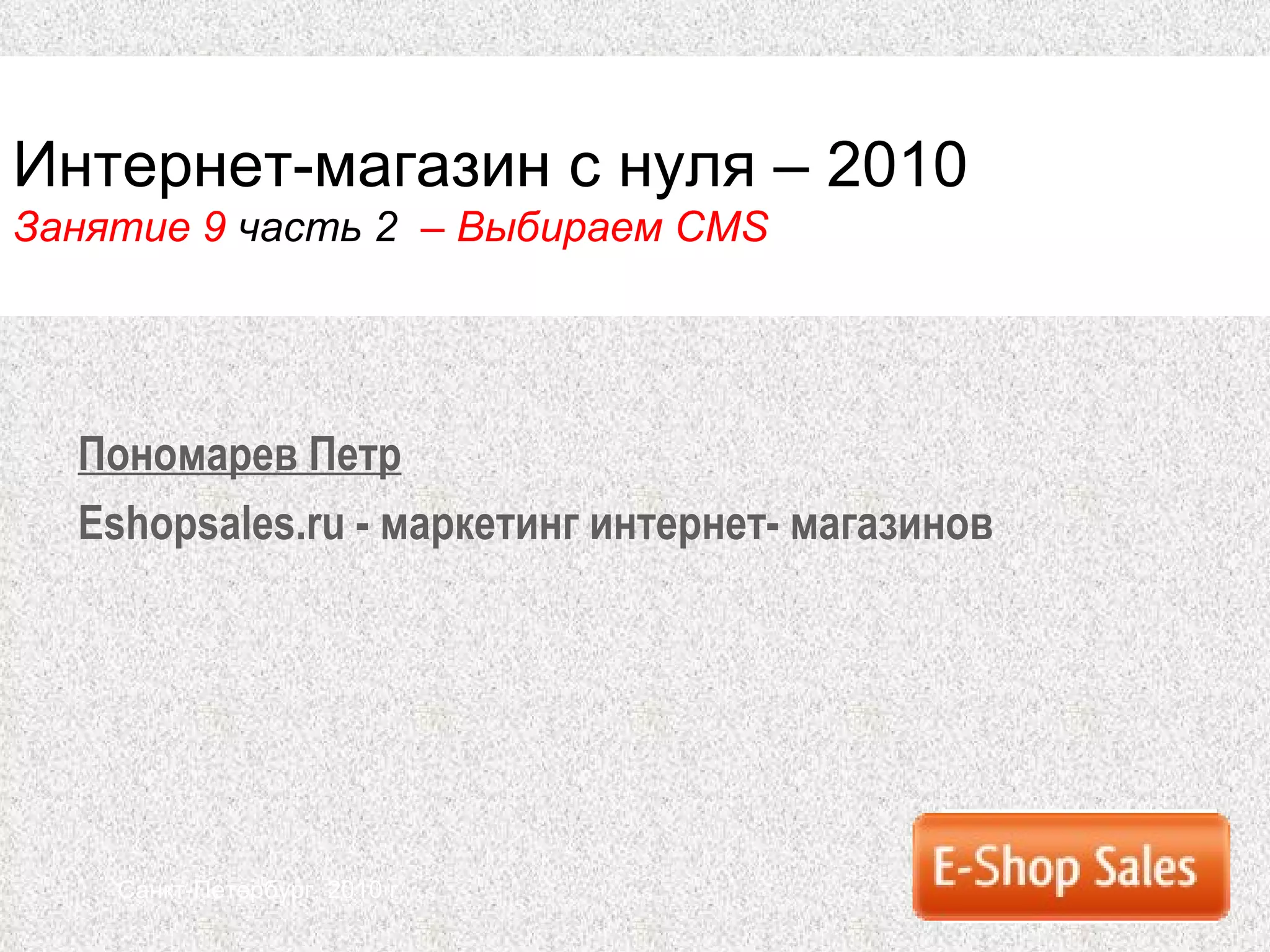 Документ представляет собой руководство по выбору CMS для интернет-магазинов с фокусом на различные аспекты, такие как типовые и не типовые проекты, требования к функциональности и интеграции. Петров Пономарев рассматривает преимущества и недостатки различных CMS, а также технические требования, необходимые для успешного запуска интернет-магазина. В конце документа есть информация о следующем занятии, на котором будут обсуждаться конкретные CMS и их особенности.