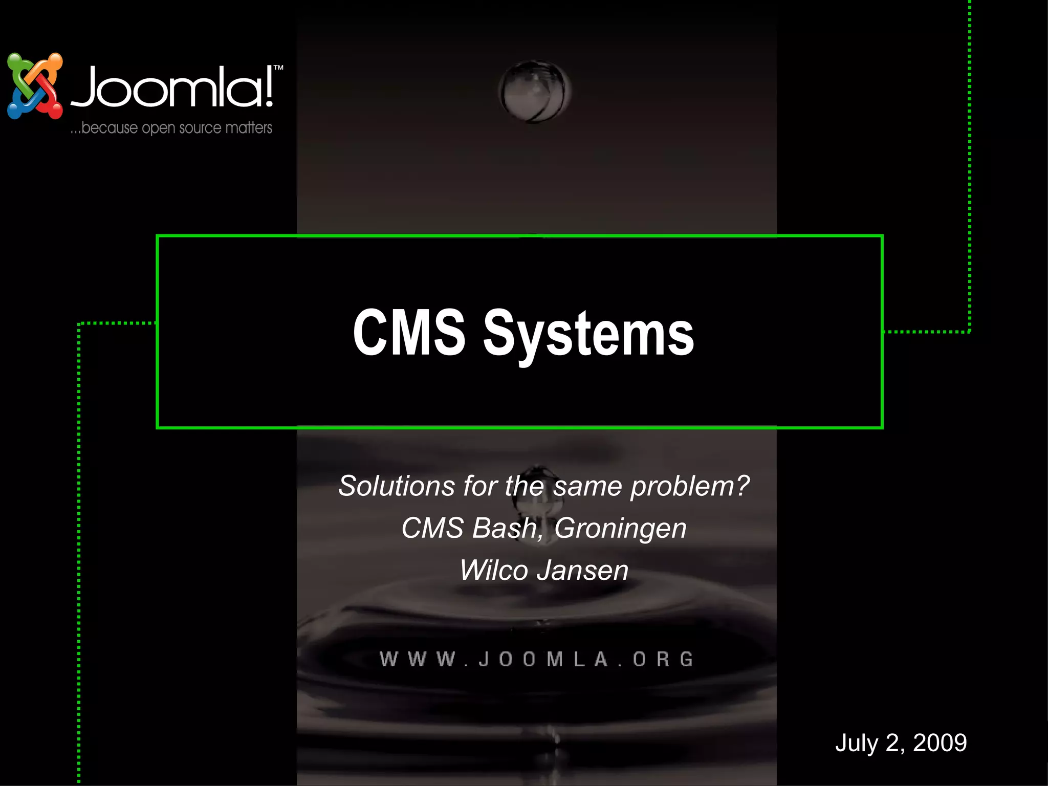This document discusses several open source content management systems (CMS), including their missions, technologies used, licenses, and communities. It compares CMS solutions like Drupal, Joomla, Plone, TYPO3, and WordPress, looking at their stated missions and visions. It also notes that over 1,000 CMS solutions exist to solve similar problems in different ways. The document suggests reading about the CMS options or using common sense to select the best solution for a given purpose.