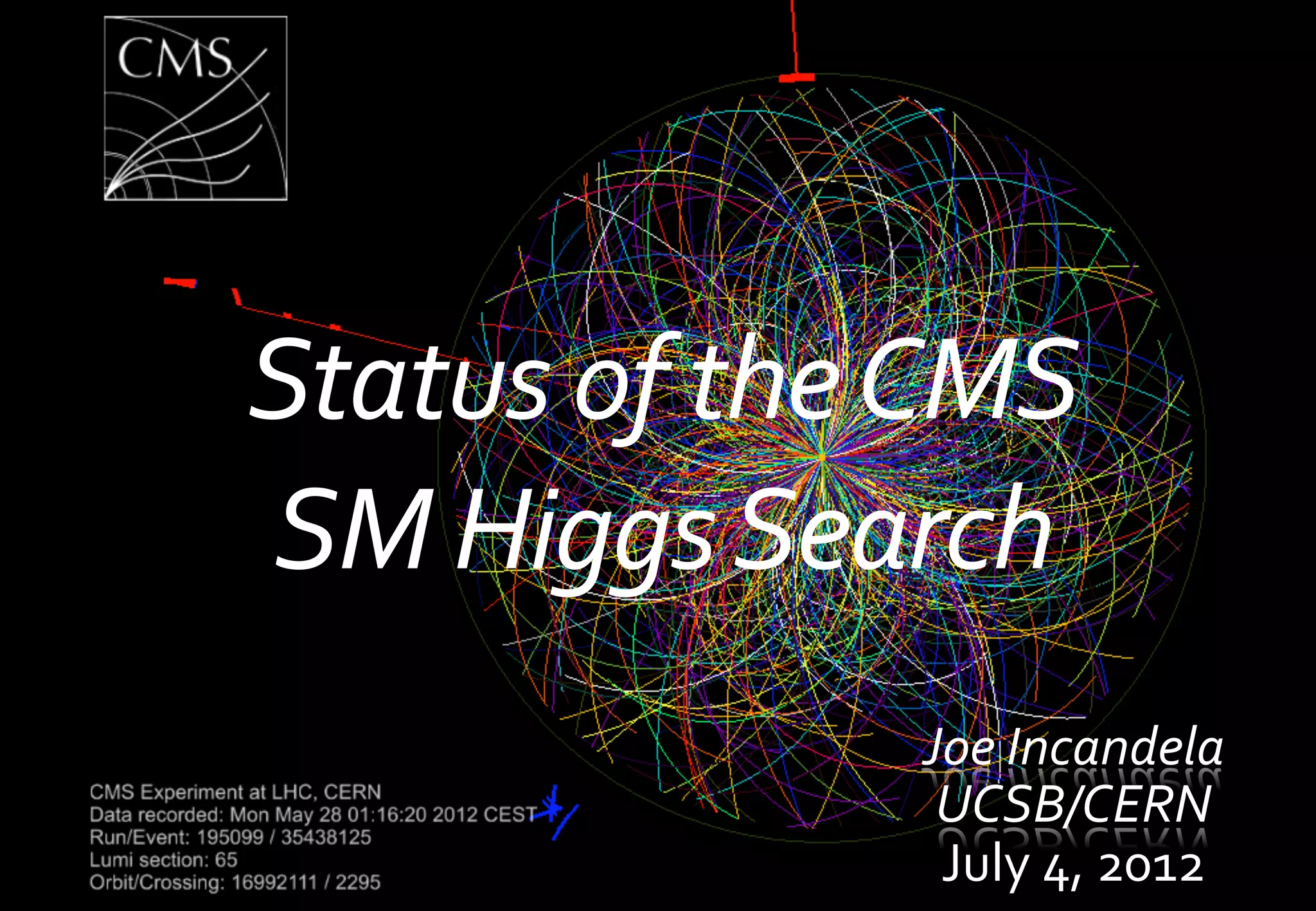 The document discusses the status of the CMS SM Higgs search. It notes that the Standard Model has been confirmed to better than 1% uncertainty by precision measurements, with the Higgs boson being the only missing piece. The search has eliminated about 475 GeV of the possible Higgs mass range between previous data from the Tevatron and LHC. With more data being collected at 8 TeV, CMS will be able to further probe the remaining mass range by exploiting multiple production and decay modes of the Higgs.