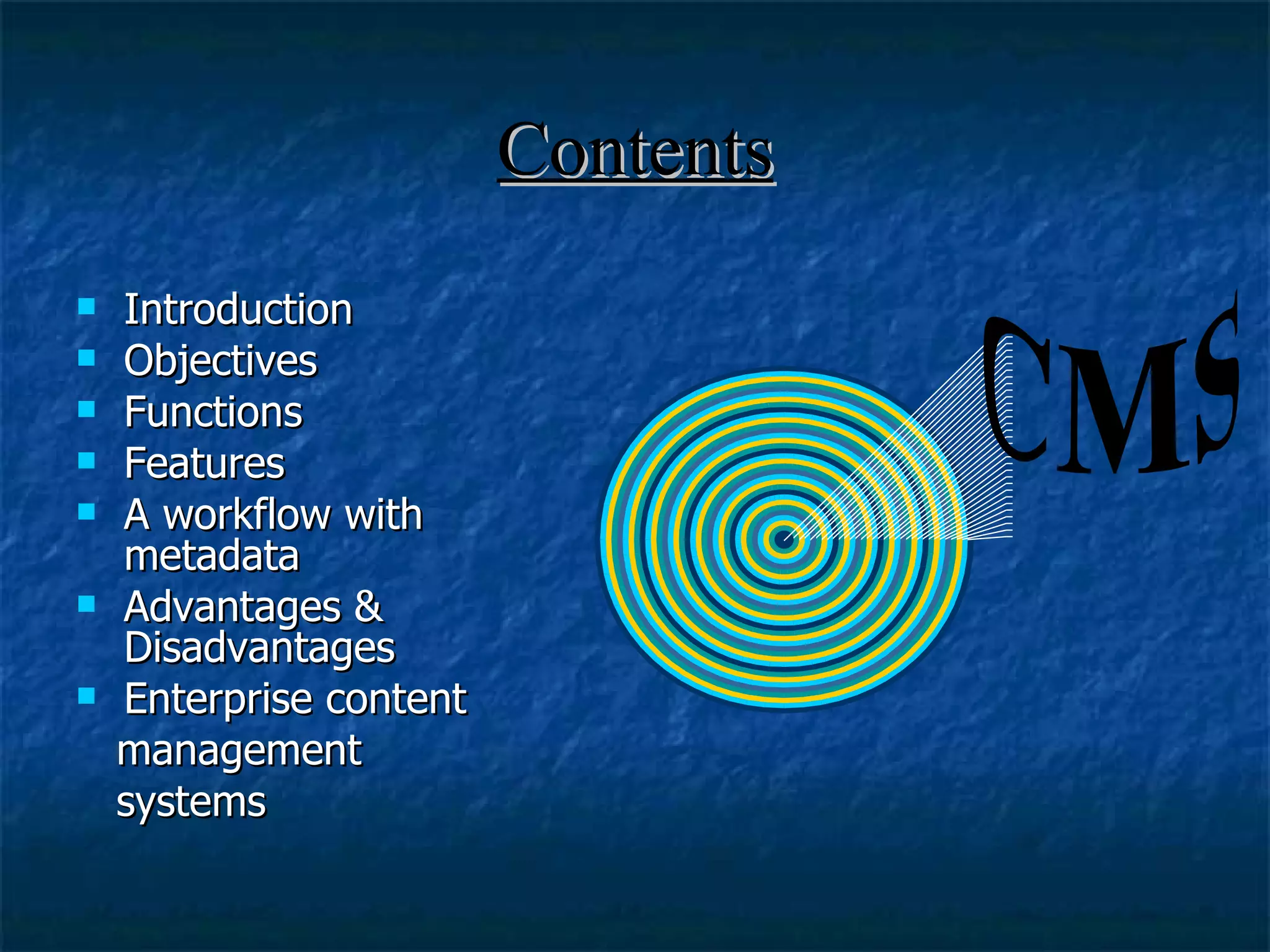 A content management system (CMS) allows large numbers of people to share stored data, control access to data based on user roles, aid in easy storage and retrieval of data, and reduce repetitive duplicate input. A CMS consists of a content management application and a content delivery application. It aims to devolve content creation, provide security and approval processes, and improve quality. Key features include integrated help, extensibility, user management, permissions, templates, and localization. Content is created using templates and workflows to simplify the upload, approval, and publishing process. Examples of popular CMS platforms include Drupal and Joomla, which are both open source and widely used.