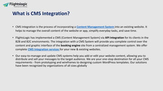 CMS integration involves incorporating a content management system into existing websites to streamline content management and facilitate user control over site content. Flightslogic offers tailored CMS development services, allowing organizations in the travel industry to enhance operational efficiency and improve customer service through easy management of web content. Key features include SEO-friendliness, booking management, and extensive customization options, making it suitable for businesses of all sizes.