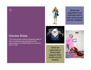 This chapter discusses how gender roles are communicated and learned within families. It notes that gender roles associate mothers with femininity, caretaking, and housework, while fathers are expected to be masculine financial providers. Children learn about gender through observing parents and interactions within the family. The socialization process teaches children gendered behaviors and expectations through play, toys, and parental feedback. The chapter advocates for moving beyond restrictive gender roles to allow all family members the flexibility to develop their individual identities and share parenting responsibilities equitably.