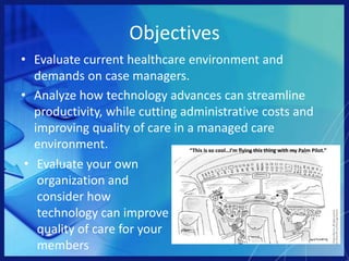This document discusses how technology can help streamline case manager processes and improve outcomes. It evaluates the current healthcare environment and how technology advances like workflows and dashboards can enhance productivity. It also presents a case study where collaboration technology helped a managed care provider eliminate paper-based systems and improve productivity and customer service. The document advocates that organizations evaluate how technology can improve quality of care.