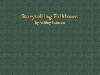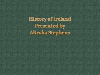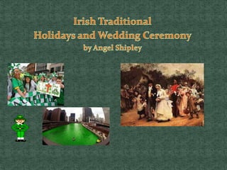 Ireland has a long history dating back 7,500 BC with successive waves of settlers including farmers, Celts, Christians, Vikings, and English shaping Irish culture. The country has faced conflicts between groups but also benefited from their contributions like iron tools. Traditional Irish holidays celebrate saints and seasons through customs like wearing green on St. Patrick's Day. Irish weddings incorporate traditions such as handfasting ceremonies and Claddagh rings. Storytelling of folklore has been an important part of passing cultural knowledge through oral tradition in Ireland.