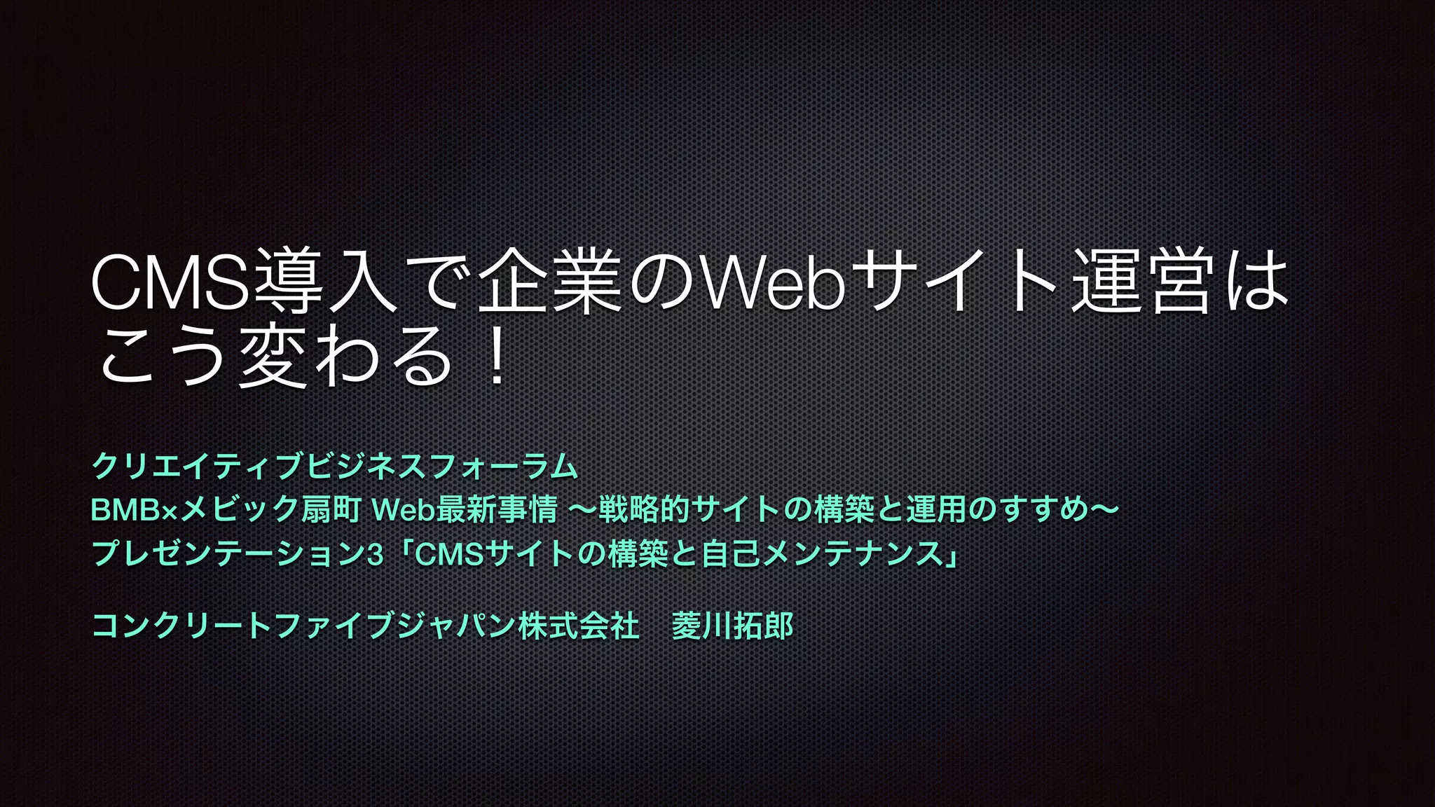 クリエイティブビジネスフォーラム BMB×メビック扇町 Web最新事情 〜戦略的サイトの構築と運用のすすめ〜 プレゼンテーション「CMSサイトの構築と自己メンテナンス」の枠で発表した資料です。