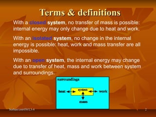 This document defines key terms and concepts in thermodynamics. It discusses systems, surroundings, and the universe. It describes closed, isolated, and open systems. It also defines intensive and extensive properties, homogeneous and heterogeneous systems, temperature scales, states of matter, state and path functions, processes like isothermal and adiabatic, and equilibrium.