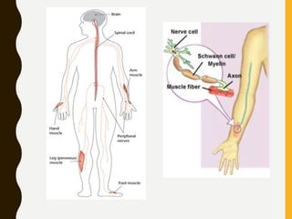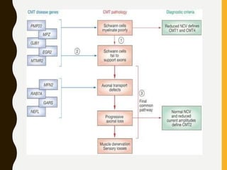 Charcot-Marie-Tooth disease (CMT) is a group of inherited neurological disorders that damage the peripheral nerves, causing muscle weakness, loss of sensation in the feet and hands, and deformities. CMT is caused by genetic mutations that affect the myelin sheath or axons in the nerves. There are several types of CMT including CMT1, CMT2, CMT4 and CMTX, which are distinguished by their genetic causes and symptoms. Currently there is no cure for CMT but treatment focuses on managing symptoms through physical therapy, bracing, and surgery. Researchers are investigating potential new treatments to help prevent disability and progression of the disease.