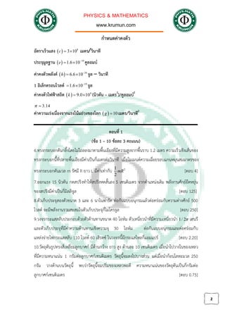 8 3 10c เมตร/วินาที ประจุมูลฐาน 19 1.6 10e คูลอมบ คาคงตัวพลังค 34 6.6 10h จูล – วินาที 1 อิเล็กตรอนโวลต 19 1.6 10 จูล คาคงตัวไฟฟาสถิต 9 9.0 10k (นิวตัน – เมตร2 )/คูลอมบ2 3.14π คาความเรงเนื่องจากแรงโนมถวงของโลก 10g เมตร/วินาที2 ตอนที่ 1 (ขอ 1 – 10 ขอละ 3 คะแนน) 6.ทรงกระบอกตันกลิ้งโดยไมไถลลงมาตามพื้นเอียงที่มีความสูงจากพื้นราบ 1.2 เมตร ความเร็วเชิงเสนของ ทรงกระบอกนี้ที่ปลายพื้นเอียงมีคาเปนกี่เมตรตอวินาที เมื่อโมเมนตความเฉื่อยรอบแกนหมุนสมมาตรของ ทรงกระบอกตันมวล m รัศมี R ยาว L มีคาเทากับ 21 2 mR [ตอบ 4] 7.ออกแรง 15 นิวตัน กดสปริงทําใหสปริงหดสั้นลง 5 เซนติเมตร จากตําแหนงเดิม พลังงานศักยยืดหยุน ของสปริงมีคาเปนกี่มิลลิจูล [ตอบ 125] 8.ตัวเก็บประจุสองตัวขนาด 3 และ 6 นาโนฟารัด ตอกันแบบอนุกรมแลวตอครอมกับความตางศักย 500 โวลต จะมีพลังงานรวมสะสมในตัวเก็บประจุกี่ไมโครจูล [ตอบ 250] 9.วงจรกระแสสลับประกอบดวยตัวตานทานขนาด 40 โอหม ตัวเหนี่ยวนําที่มีความเหนี่ยวนํา 1/ 2π เฮนรี และตัวเก็บประจุที่มีคาความตานทานเชิงความจุ 30 โอหม ตอกันแบบอนุกรมและตอครอมกับ แหลงจายไฟกระแสสลับ 110 โวลต 60 เฮิรตซ ในวงจรนี้มีกระแสไหลกี่แอมแปร [ตอบ 2.20] 10.วัตถุตันรูปทรงสี่เหลี่ยมลูกบาศก มีดานกวาง ยาว สูง ดานละ 10 เซนติเมตร เมื่อนําไปวางในของเหลว ที่มีความหนาแนน 1 กรัมตอลูกบาศกเซนติเมตร วัตถุนี้จมลงไปบางสวน แตเมื่อนํากอนโลหะมวล 250 กรัม วางดานบนวัตถุนี้ พบวาวัตถุนี้จมปริ่มของเหลวพอดี ความหนาแนนของวัตถุตันเปนกี่กรัมตอ ลูกบาศกเซนติเมตร [ตอบ 0.75]