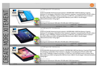 This document provides product information for several cmx® MID mobile devices including models Clanga 097-2032 BT 3G, Aquila 097-1016, and Rapax 090-0508. For each product, the document lists features, included items in delivery, EAN codes, packing quantities, and pallets quantities.