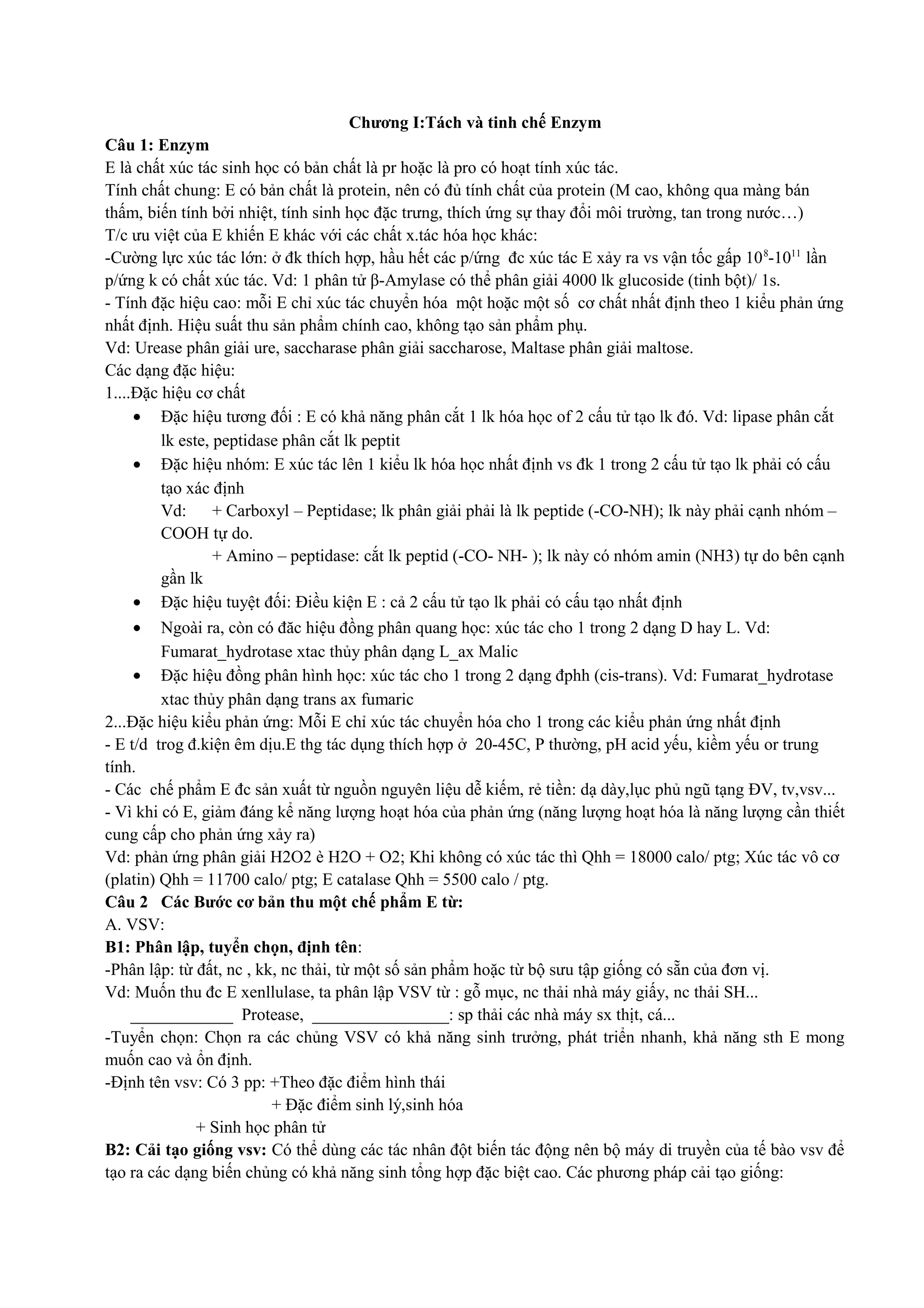 Enzyme (e) là chất xúc tác sinh học có bản chất là protein, có tính chất như cao, không qua màng bán thấm và rất đặc hiệu cho từng loại phản ứng. Việc thu chế phẩm e từ vi sinh vật (vsv) trải qua các bước như phân lập, tuyển chọn, nuôi cấy và tách tinh chế, với nhiều phương pháp khác nhau nhằm tối ưu hóa năng suất và chất lượng. Quá trình này bao gồm trích ly, phân đoạn và tinh sạch để thu được enzyme với độ tinh khiết cao, phục vụ cho các ngành công nghiệp khác nhau.