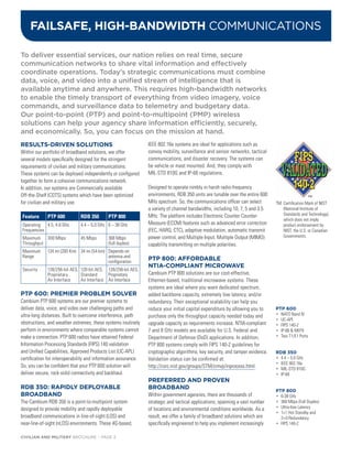 The document summarizes Cambium Networks' point-to-point and rapid deployment broadband wireless solutions for civilian and military applications. It describes their portfolio of solutions including the PTP 600 for long-distance connectivity, RDB 350 for rapid deployability, and PTP 800 for affordable microwave. It provides examples of how these solutions have been used for applications such as test range communications, convoy mobility, ship-to-shore connectivity, and more.