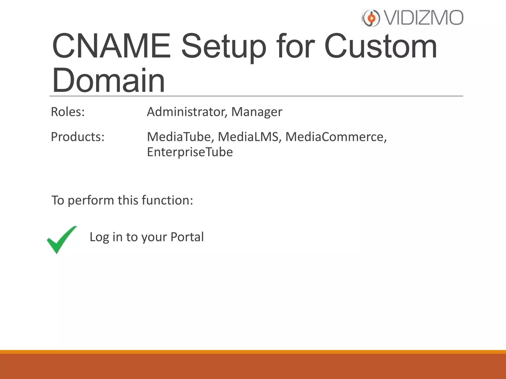 This document is a tutorial on setting up a CNAME for custom domains on Vidizmo. It outlines the roles involved, products supported, and provides steps such as logging into your portal and creating a new channel. Additional resources and support information are also included for users.