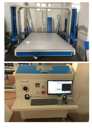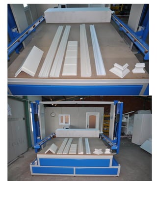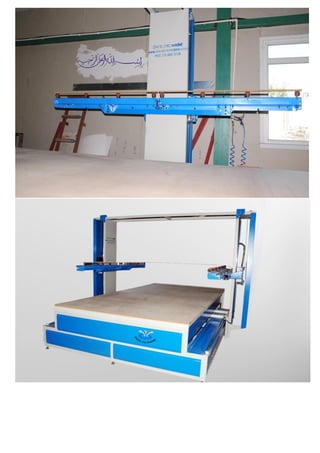 This document summarizes the specifications of a CNC EPS Styrofoam cutting machine. The machine has dimensions of 3570 x 3250 x 2500 mm and can cut Styrofoam blocks vertically and horizontally. It has 30 hot wire cutters that can cut pieces up to 2100 mm x 1450 mm. The machine is powered by 2 x 4.5 NM motors on the X and Y axes and uses Mach 3 and G-Code control programs to cut insulation and decoration pieces for construction.
