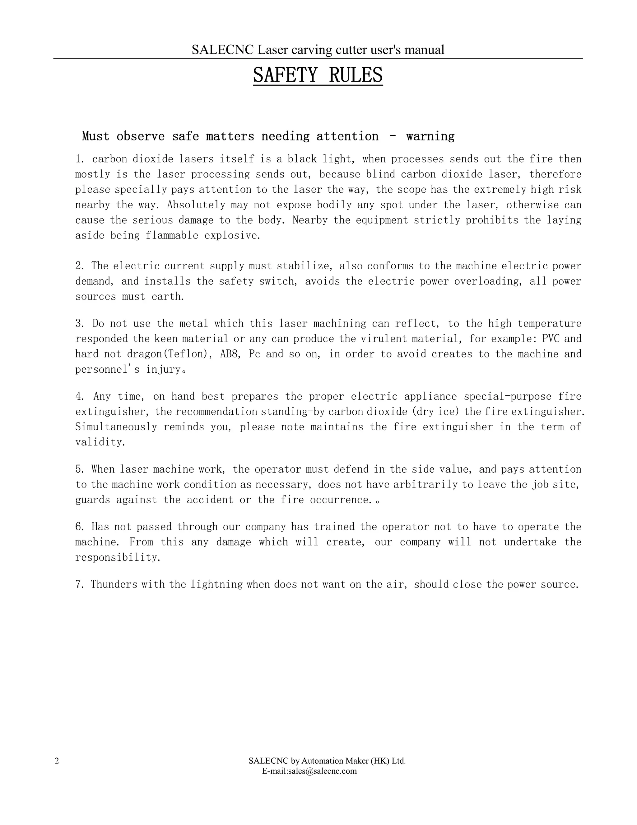 The document is a user manual for the CNC laser carving cutter by Automation Maker (HK) Ltd, detailing safety precautions, working conditions, product specifications, and operational guidelines. Key safety rules include avoiding exposure to the laser, ensuring stable electrical supply, and preventing the use of reflective or toxic materials near the cutter. The manual also provides troubleshooting tips, equipment maintenance guidance, and outlines the environment suitable for optimal machine operation.