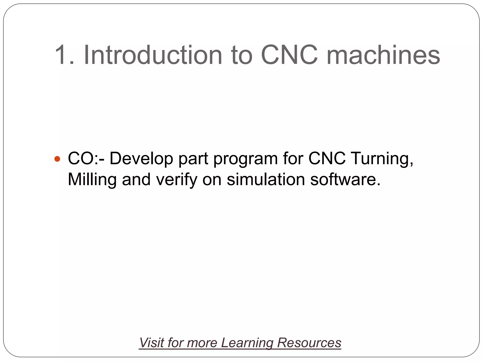 This document provides an introduction to computer numerical control (CNC) machines. It discusses that CNC machines operate using programmed codes rather than manual control. The document outlines various CNC operations like milling and drilling. It describes the advantages of CNC machines as being able to operate continuously with high accuracy, batch production, and ability to update software. Five-axis CNC machines are discussed as able to machine complex shapes in a single setup. Specifications are provided for a sample five-axis CNC machine including its travel distances and spindle capabilities.
