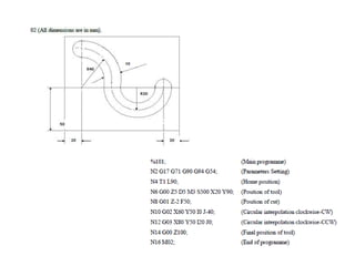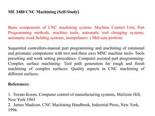 This document discusses CNC (computer numerical control) machining. It covers basic components of a CNC system including the machine control unit and describes part programming methods. It discusses sequential controllers and manual part programming. It also covers tool path generation for rough and finish machining of complex surfaces and quality aspects of CNC machining. References for further reading on the topic are provided at the end.