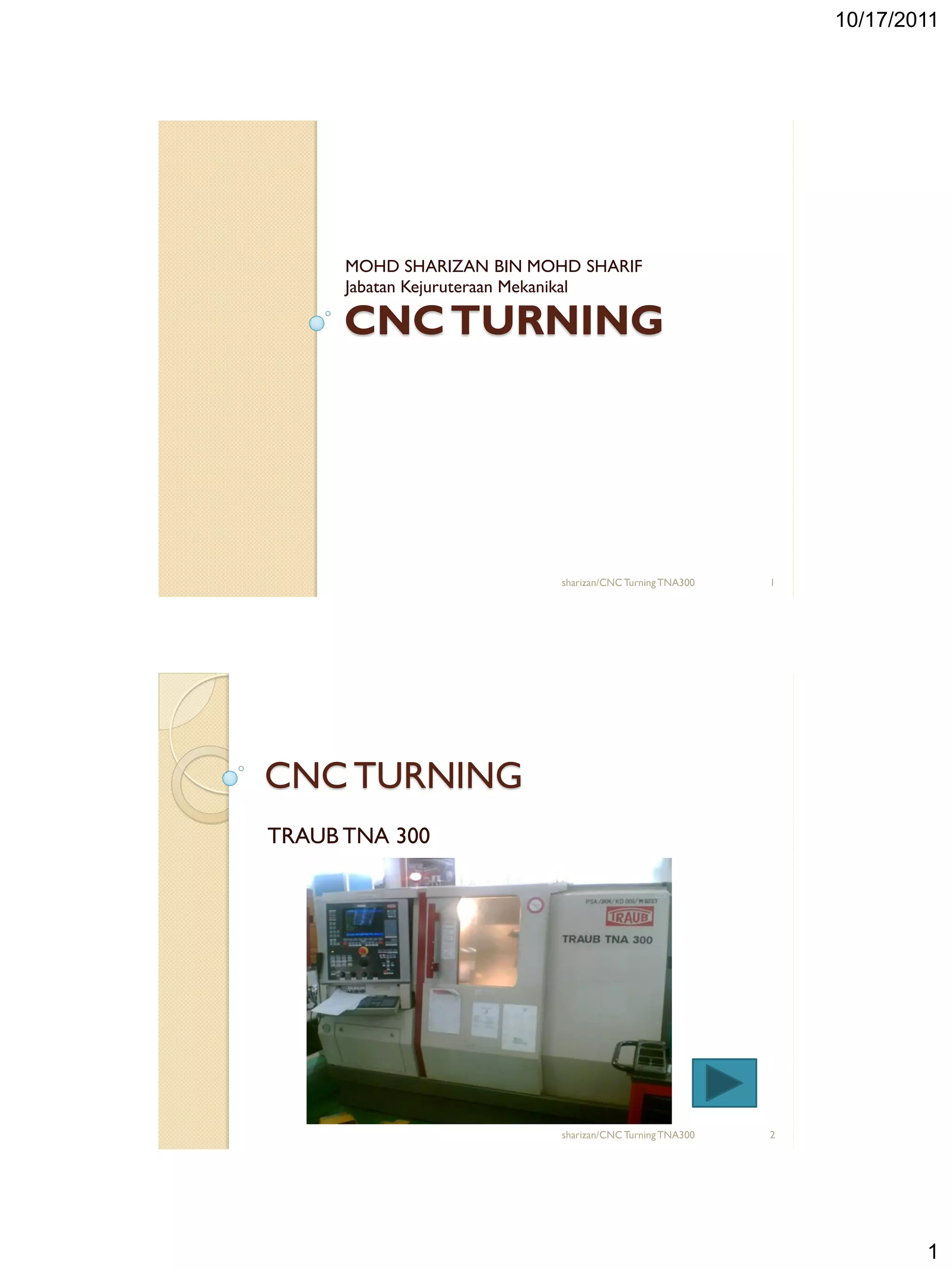 The document provides information about CNC turning processes using a TRAUB TNA 300 machine. It describes the machine axes and various cutting operations like turning and milling. It also explains coordinate systems and common G and M code commands used in CNC programs. Examples of full CNC turning programs are given to demonstrate programming techniques for roughing, cutting and finishing operations. Finally, exercises are presented for students to practice writing their own CNC programs.
