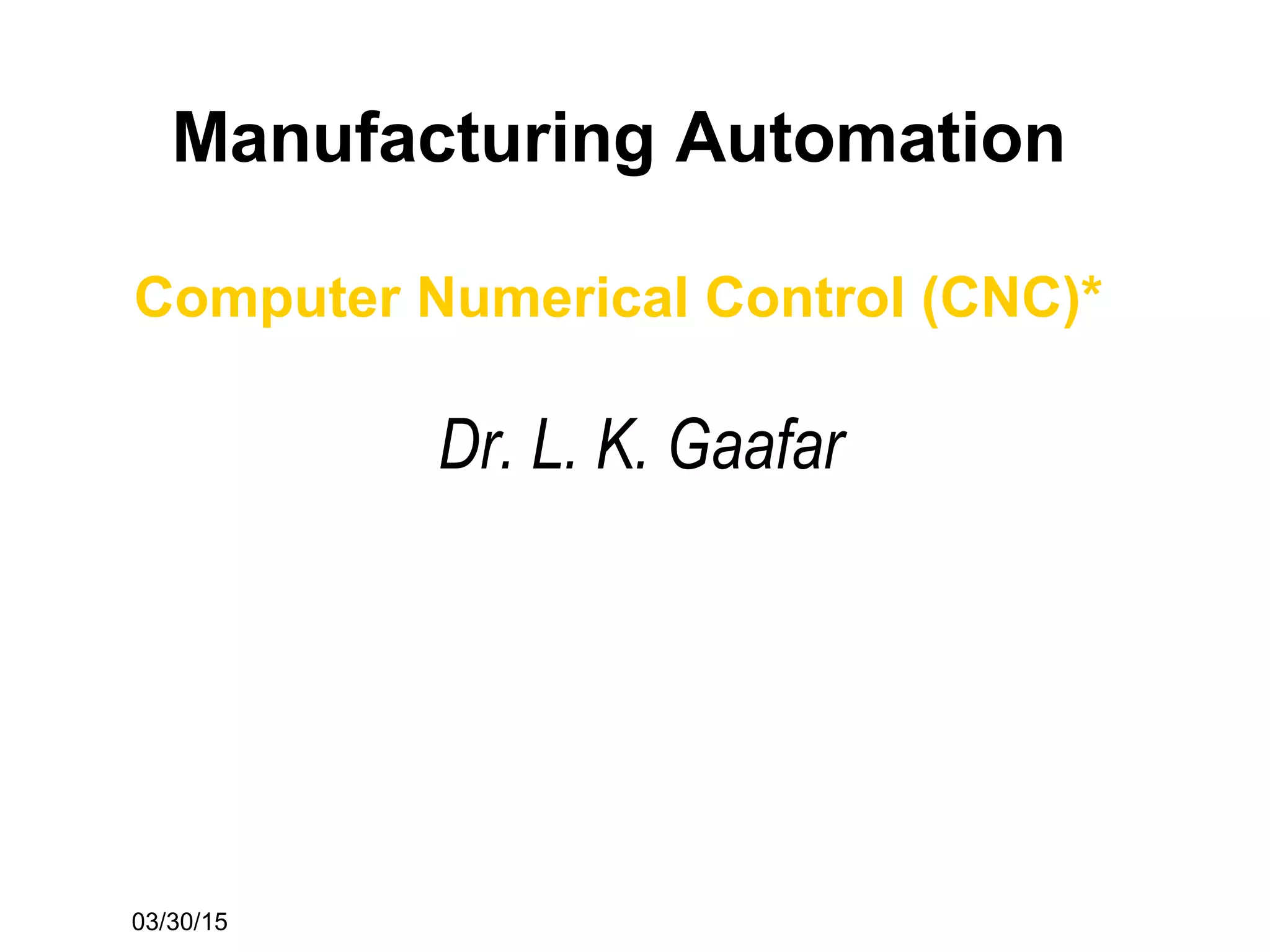 The document provides information about numerical control and computer numerical control (CNC) manufacturing. It discusses the components and process of numerical control, how CNC improved on this with a microprocessor, and part programming using APT. It then gives an example of an APT program for machining a cylindrical part and interpreting the code in the program.