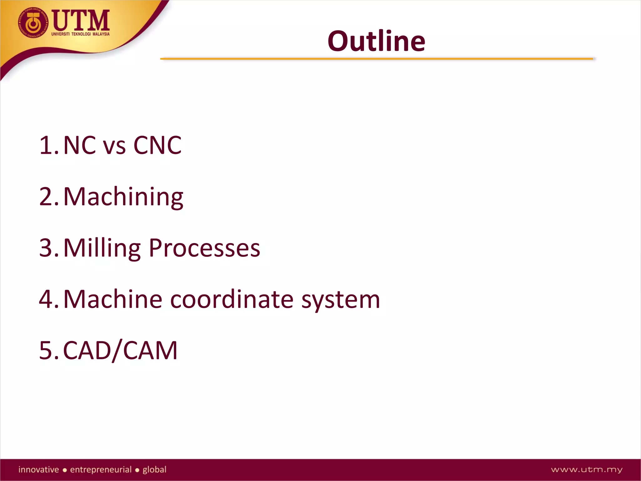 This document provides an introduction to CNC milling. It begins by defining NC and CNC, explaining that CNC refers to a computer connected to an NC machine to increase versatility. It then discusses the basic components of an NC system, including the program of instructions, control unit, and machine tool. The document outlines different milling processes like face milling and end milling. It also explains machine coordinate systems and CAD/CAM software integration. Advantages of CNC include increased productivity and accuracy while limitations include high costs.