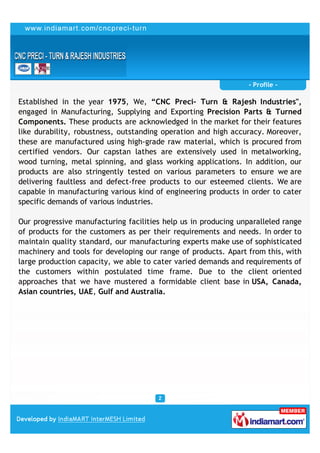 CNC Preci-Turn & Rajesh Industries, established in 1975, specializes in manufacturing and exporting precision turned and press components, including various alloys and plastic dies. The company serves multiple industries by providing high-quality products, backed by rigorous testing and advanced manufacturing facilities, while maintaining a strong client base across regions such as the USA, Canada, and the Middle East. Their extensive product range includes aluminum, brass, stainless steel components, and industrial castings, catering to specific industry requirements.