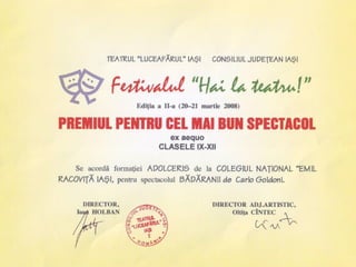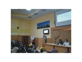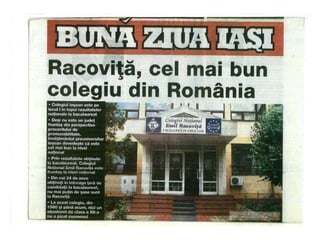The document provides an overview of Emil Racoviță National College in Iași, Romania. It discusses the college's mission to promote excellence in education and develop students to their full potential. It also provides some historical details about the college's founding and growth. Additionally, it outlines the college's educational approaches, resources, student and teacher statistics, international partnerships, extracurricular activities, and student accomplishments.