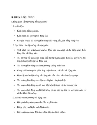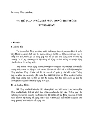 Đề án nghiên cứu vai trò quản lý của nhà nước đối với thị trường bất động sản, nhấn mạnh tầm quan trọng của thị trường này trong nền kinh tế và sự cần thiết của quản lý nhà nước để tối ưu hóa nguồn lực. Tài liệu đề cập đến các đặc điểm, vai trò và cách thức quản lý nhà nước trong lĩnh vực bất động sản, cùng với các công cụ và giải pháp cần thiết để nâng cao hiệu quả quản lý. Kết luận tổng hợp lại những điểm chính và phương hướng phát triển trong quản lý bất động sản.