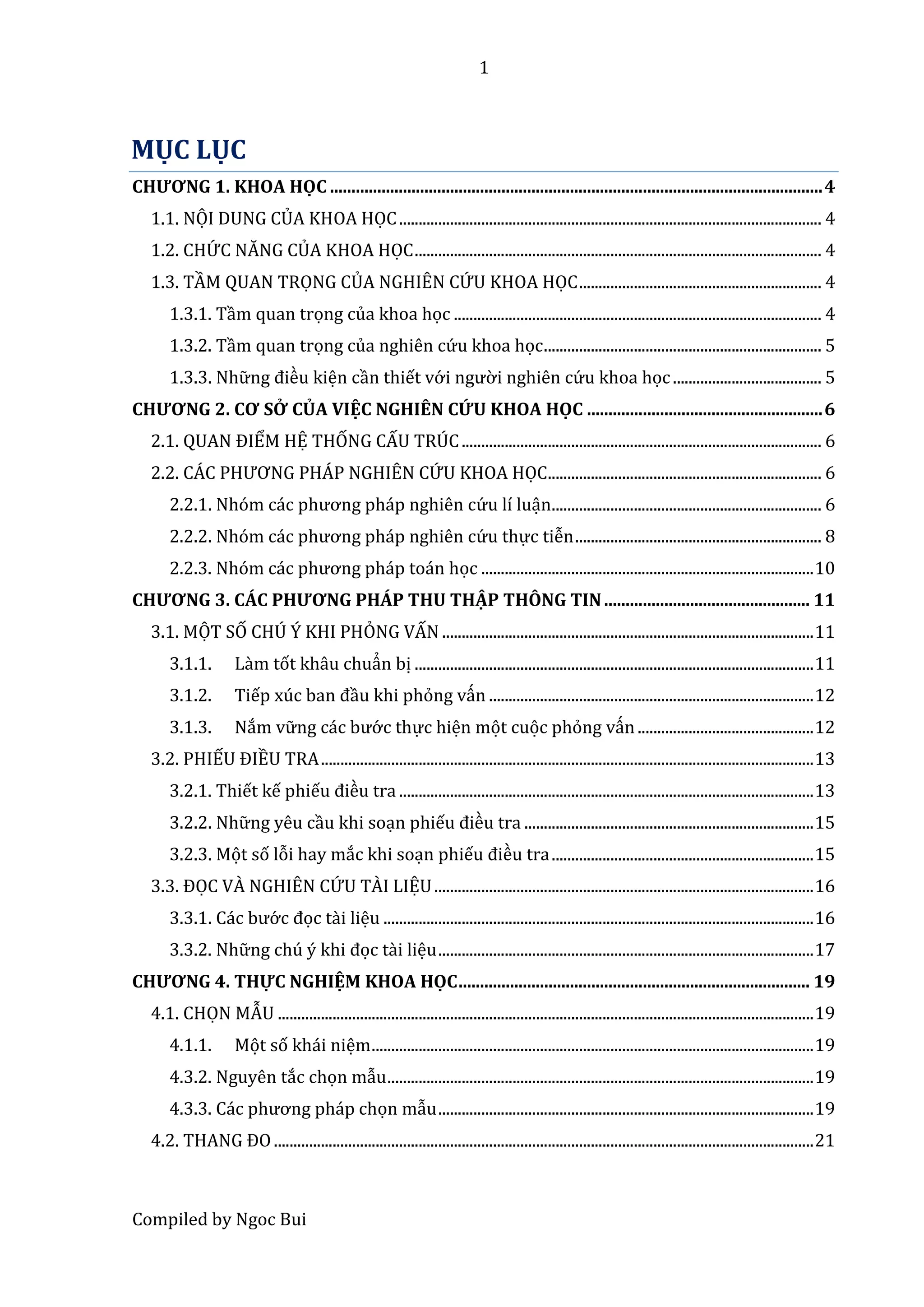 Tài liệu cung cấp cái nhìn tổng quan về phương pháp luận nghiên cứu khoa học, bao gồm nội dung, chức năng và tầm quan trọng của khoa học và nghiên cứu khoa học. Nó mô tả các phương pháp thu thập thông tin, thực nghiệm khoa học, và cách viết báo cáo nghiên cứu. Cuối cùng, tài liệu nêu ra các giai đoạn trong quá trình nghiên cứu khoa học, từ việc chọn đề tài đến thực hiện và báo cáo kết quả.