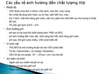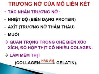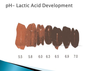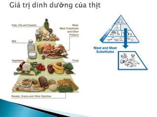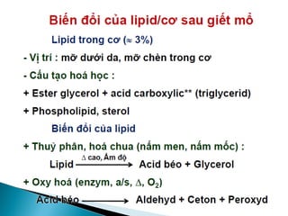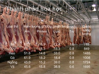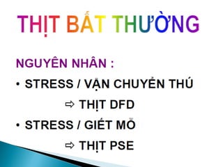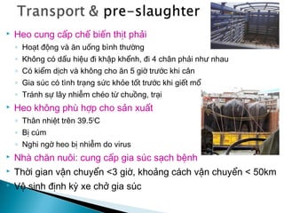 Tài liệu trình bày các yêu cầu và quy trình liên quan đến chế biến thịt heo và bò, bao gồm tiêu chuẩn sức khỏe, vận chuyển và chăm sóc trước khi giết mổ. Nó cũng đề cập đến các yếu tố ảnh hưởng đến chất lượng thịt sau khi giết mổ, chẳng hạn như stress, phương pháp gây mê và xử lý thịt. Cuối cùng, tài liệu phân loại thịt theo trọng lượng và chất lượng, cùng với các tiêu chí đánh giá khác.