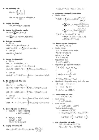 Tài liệu đề cập đến các khái niệm cơ bản trong thông tin học, bao gồm độ đo thông tin, lượng tin tương hỗ, entropi, và mã hóa nguồn. Nó cũng thảo luận về các công thức xác suất, mã sửa sai và các định lý liên quan đến mã hóa, đặc biệt là mã Huffman và giới hạn Hamming. Các nội dung này giúp hiểu rõ hơn về cách truyền tải và tối ưu hóa thông tin trong hệ thống truyền thông.
