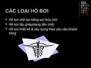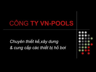 Công ty VN-Pools chuyên thiết kế, xây dựng và cung cấp các loại hồ bơi, bao gồm hồ bơi chế tạo bằng sợi thủy tinh và hồ bơi lắp ghép. Hồ bơi được xây dựng theo yêu cầu khách hàng, có kích thước và thiết kế tùy chỉnh, với chi phí hồ bơi sợi thủy tinh khoảng 17.500 USD. Tất cả các thiết bị lắp đặt đều có thể được khách hàng lựa chọn.