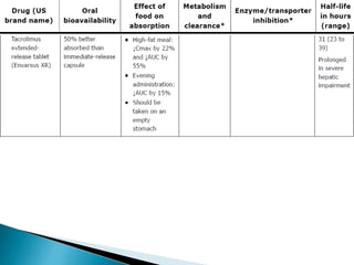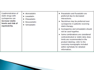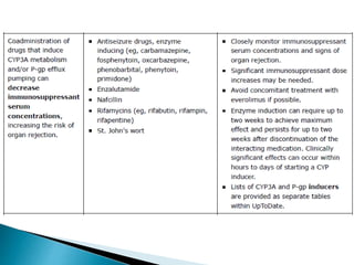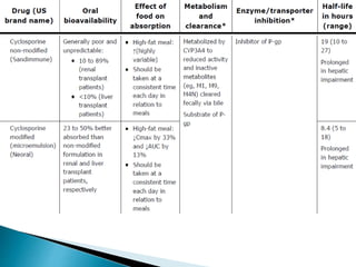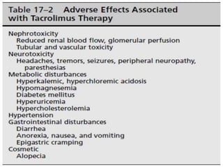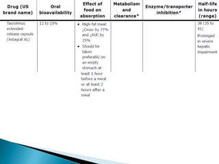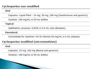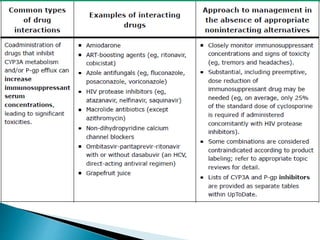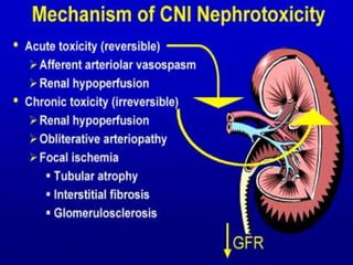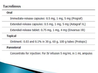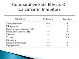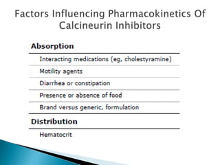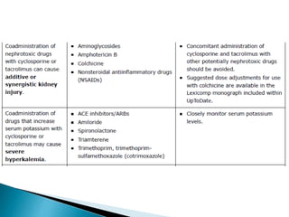 This document discusses maintenance immunosuppressive therapy for kidney transplant recipients. It provides details on tacrolimus and cyclosporine, including their mechanisms of action, dosing, therapeutic drug monitoring, and conversion between formulations. Adverse effects and contraindications are also summarized. Monitoring drug levels is important for efficacy and toxicity, with target trough ranges outlined for different time periods post-transplant.