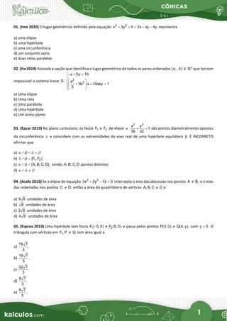 The document contains 15 multiple choice questions about conic sections (ellipses, hyperbolas, parabolas). The questions test concepts like identifying the type of conic represented by an equation, properties of conics like the relationship between focal points and the shape, and calculating attributes like area. Sample questions ask about determining if a given equation represents an ellipse, hyperbola, or parabola, or finding the area of a shape defined by a conic section. The document also provides the answers to the questions.