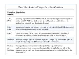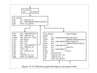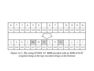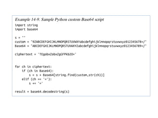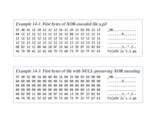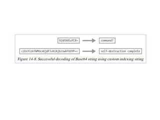 Chapter 13 of the practical malware analysis discusses various data encoding techniques used by malware to obfuscate information and avoid detection. It covers simple ciphers, XOR encoding, base64 encoding, and strong cryptographic algorithms, detailing their implementation and implications for malware analysis. The chapter also explores methods for identifying and reversing these encoding schemes, using tools like IDA Pro and various plugins to analyze entropy and detect malicious patterns.
