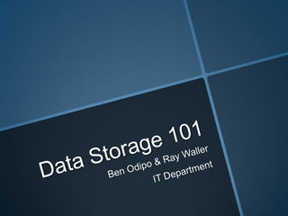 This document provides an overview of data storage options, both locally and in the cloud. It discusses current and future plans for an enterprise storage solution and transitioning to a standard district email system. Basic maintenance tips are also included, such as keeping Windows updated, backing up files, using secure passwords, avoiding unknown links/emails/software, and properly shutting down equipment. Future remote access options like VDI and VMWARE are also mentioned.