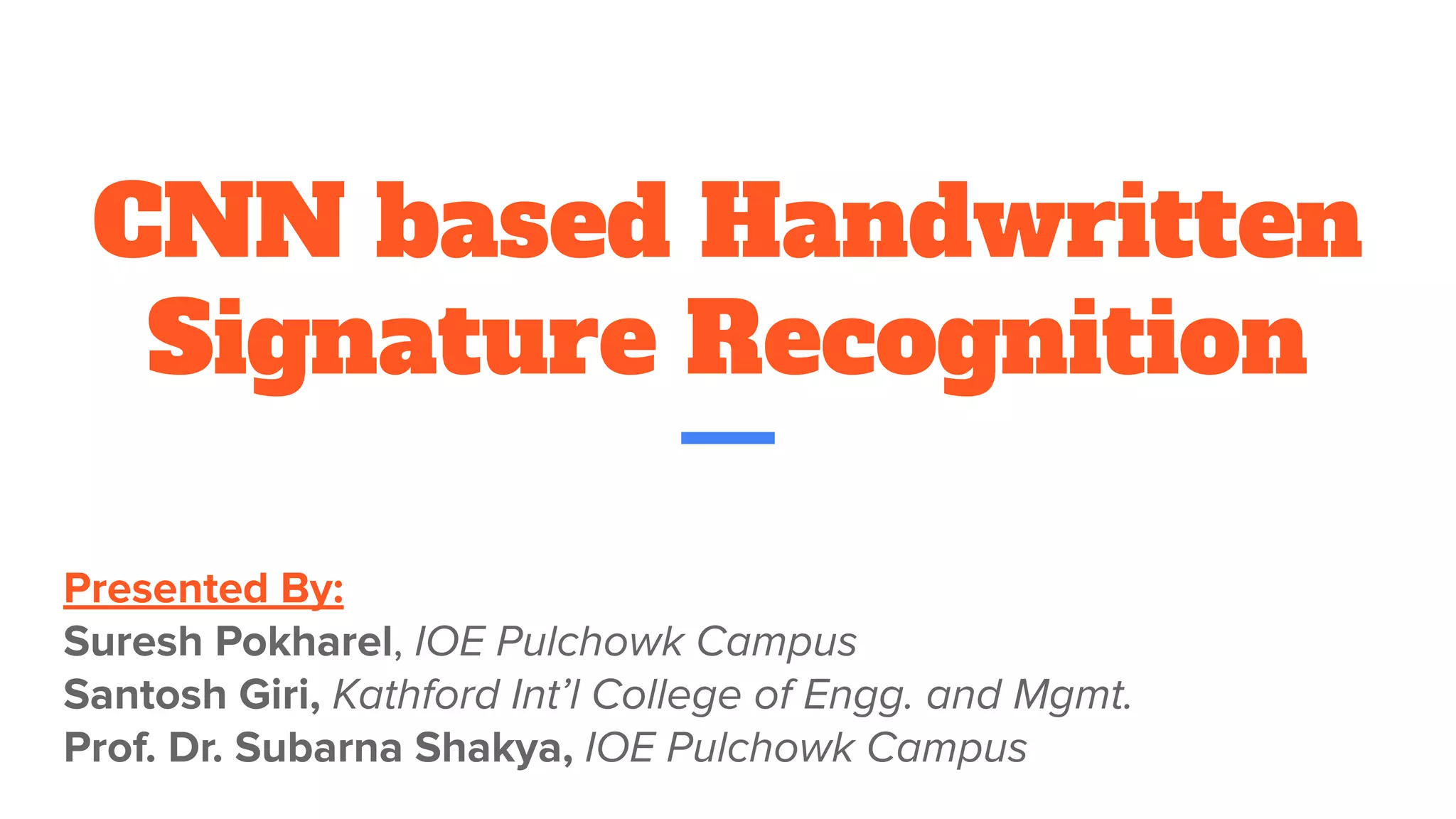 The document presents a CNN-based approach for handwritten signature recognition, emphasizing its importance in verifying legal documents to combat forgery. It discusses the methodology, which includes data preprocessing and the use of the GoogLeNet model for classification and feature extraction. The study outlines the experimental setup, data specifications, and mentions the training and validation process, highlighting the critical nature of signature validation.