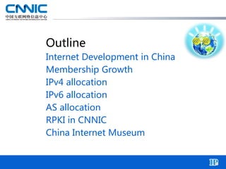 The document discusses the current state of internet development in China, highlighting there are 688 million internet users and significant growth in IPv4 and IPv6 address allocations by CNNIC. It details the establishment of RPki practices, including a test-bed and pilot platform, to enhance data synchronization and security. Additionally, it mentions major projects leveraging IPv6, such as the national highway information system and e-commerce initiatives.