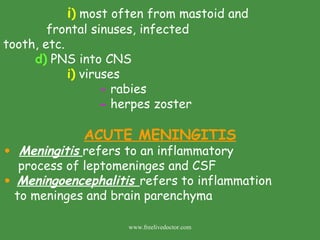 There are 4 main routes through which infectious agents can enter the central nervous system: 1) hematogenous spread, 2) direct implantation, 3) local extension from adjacent infections, and 4) spread from the peripheral nervous system. Meningitis refers to inflammation of the meninges and cerebrospinal fluid, while meningoencephalitis refers to inflammation of both the meninges and brain parenchyma. Meningitis is often classified based on the type of inflammatory exudate in the cerebrospinal fluid, such as acute pyogenic (bacterial), aseptic (viral), chronic, etc. The most common causes of acute pyogenic meningitis vary with patient age.