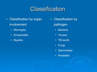 1. CNS infections can be classified by the organ involved (e.g. meningitis, encephalitis) or by pathogen (e.g. bacteria, viruses, fungi).