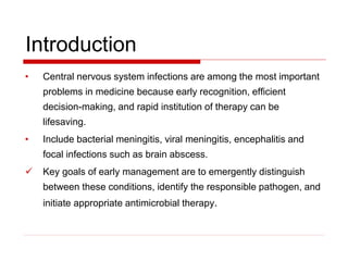 The document discusses central nervous system infections, focusing on bacterial meningitis. It outlines the epidemiology, clinical presentation, diagnosis, treatment and management of various bacterial causes of meningitis such as Streptococcus pneumoniae, Neisseria meningitidis, Listeria monocytogenes, and gram-negative bacilli. Early diagnosis and treatment with antibiotics is essential to prevent complications and reduce mortality from bacterial meningitis.