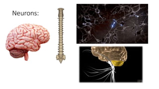 Sensory neurons receive information from the outside world through our senses, interneurons connect and communicate with each other to allow thinking and perception, and motor neurons receive impulses from the brain and send them to muscles and glands to cause muscle contractions and secretions. The document discusses the three main types of neurons - sensory, interneuron, and motor neurons - and their basic functions.