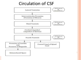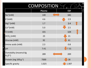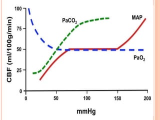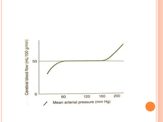 - Factors like cerebral perfusion pressure, blood gas levels, temperature, and viscosity influence cerebral blood flow through mechanisms like autoregulation. The blood-brain barrier restricts passage of molecules into brain tissue. Cerebrospinal fluid protects the brain and helps regulate int