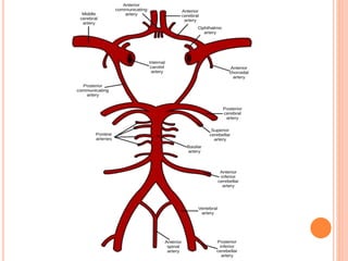 - Cerebral circulation involves blood flow to the brain through paired internal carotid and vertebral arteries. Cerebral blood flow is tightly regulated to maintain adequate oxygen and glucose delivery to brain tissue.