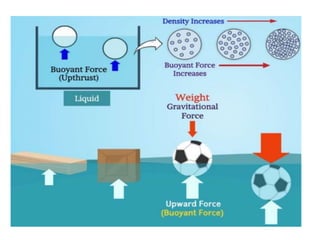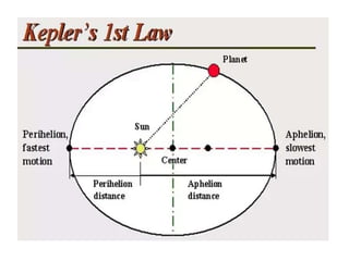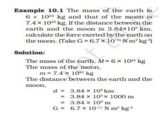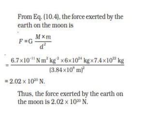 1. The document discusses concepts related to gravitation including the motion of the moon around Earth, centripetal force, Kepler's laws of planetary motion, Newton's law of universal gravitation, and Archimedes' principle.