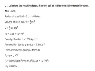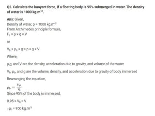 3. Archimedes' principle states that the upward buoyant force on an object immersed in a fluid is equal to the weight of fluid displaced by the object.