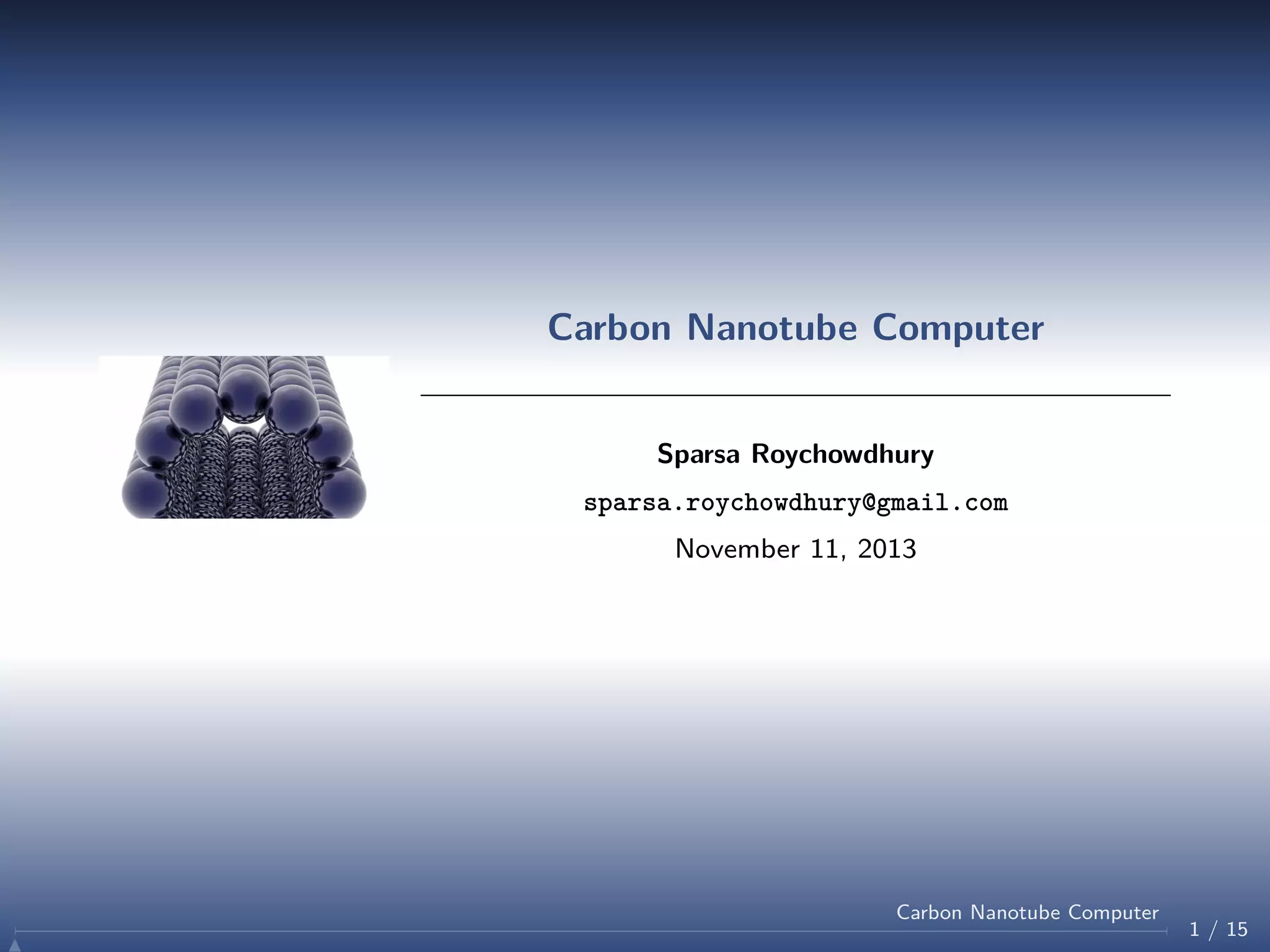 The document discusses the potential for carbon nanotube computers to replace silicon-based VLSI technology. It describes how carbon nanotubes have exceptional electrical and thermal properties and could be used to build transistors that do not suffer from energy leakage. The document outlines a prototype carbon nanotube computer that runs on a single instruction called SUBNEG and operates at much higher clock speeds with significantly lower energy usage than silicon processors. It envisions future improvements including more powerful instruction sets, denser memory, and the potential for carbon nanotubes to help extend Moore's Law. However, challenges remain in producing high purity metallic and semiconductor carbon nanotubes at scale.